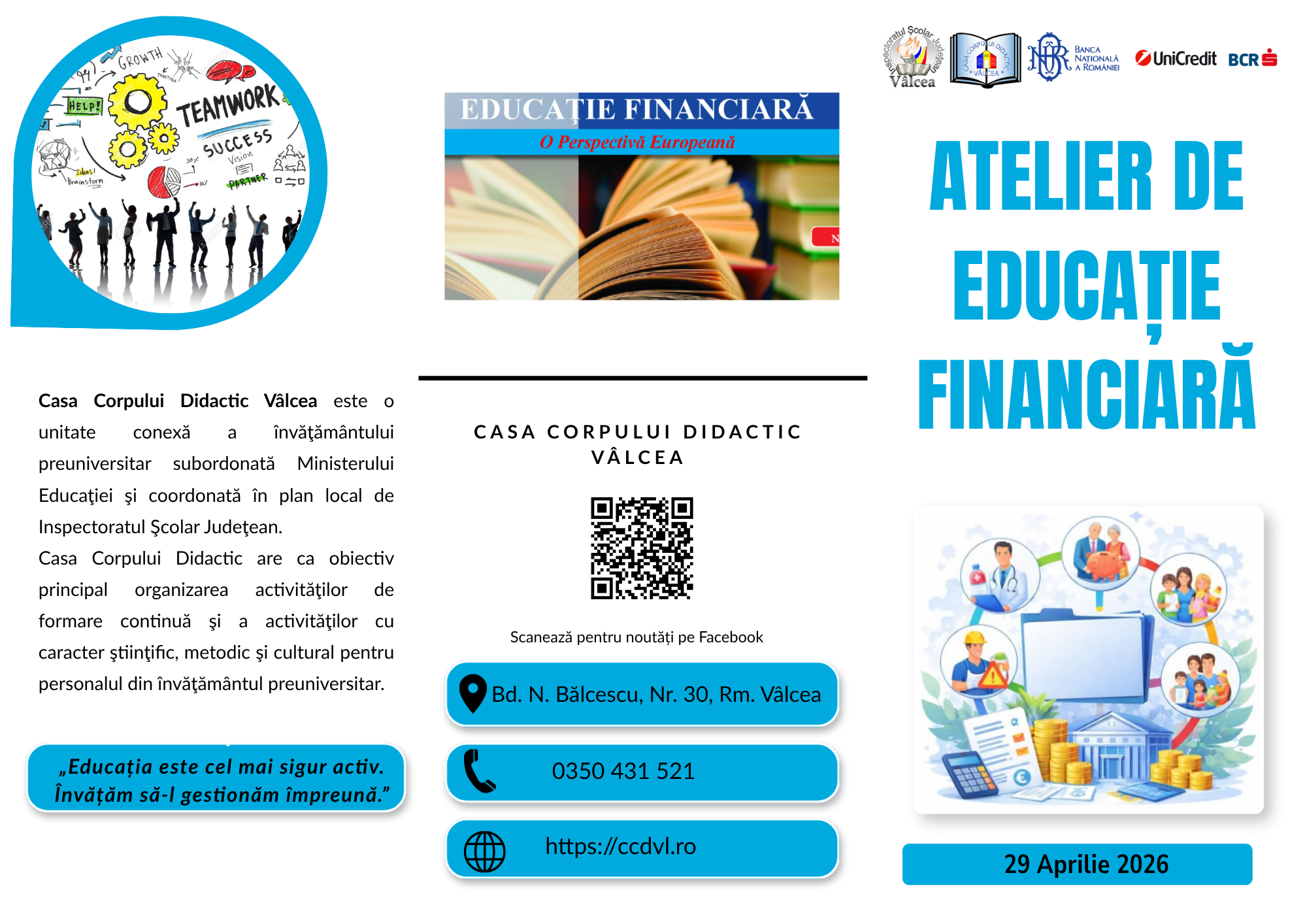 Casa Corpului Didactic Vâlcea, în parteneriat cu Inspectoratul Școlar Județean Vâlcea și principalele instituții bancare din municipiul Râmnicu Vâlcea, vă invită să participați la o sesiune de perfecționare și dialog dedicată responsabilității financiare. 🎯 Scopul Evenimentului Promovarea și implementarea educației